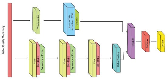 The significance of these hidden layers states is that an output is ultimately acquired. MCN-LSTM (Multiple Convolutional Network and Long Short Term Memory) was used to solve a multivariate time series classification challenge. Multivariate MCN-LSTM is the technique we suggest. To improve prediction accuracy, we expand the squeeze-and-excite block to 1D sequence models and augment the convolutional blocks of the MCN-LSTM. We can define a time series dataset as a tensor of shape (N, Q, M), where N is the number of samples in the dataset, Q is the maximum number of time steps among all variables, and M is the number of variables processed per time step because the water quality dataset now consists of multivariate time series. As a result, the multivariable time series dataset is a subset of the previous definition, where M is 1. The MCN-LSTM input must be modified to take M inputs per time step rather than a single input per time step. As shown in Figure 2, the proposed technique consists of a multiple convolutional block and an LSTM block. As a result, the multivariable time series dataset is a subset of the previous definition, with M equal to one. The MCN-LSTM input must be changed to accept M inputs per time step rather than just one. As shown in Figure 2, the suggested technique consists of a multiple convolutional blocks and an LSTM block. Batch normalization follows each convolutional layer, with a velocity of 0.98 and an epsilon of 0.002. The ReLU activation function comes after the batch normalization layer. Furthermore, the first two convolutional blocks are followed by a squeeze-and-excite block. The procedure for computing the squeeze-and-excite block in our architecture is summarized in Figure 2. We adjusted the reduction ratio r to 16 for all squeeze-and-excitation blocks. A global average pooling layer follows the final temporal convolutional block. The squeeze-and-excite block extends the FCN block by adaptively recalibrating the input feature maps. Because the reduction ratio r is set to 16, the number of parameters required to learn these self-attention maps is lowered, increasing the overall model size by 2–10%.