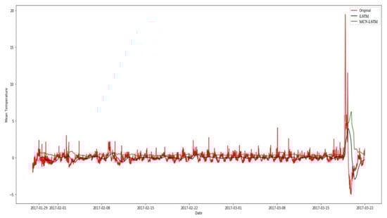 The training and validation functions for the LSTM model with layers and the MCN-LSTM technique are illustrated in Figure 6. On the x-axis, the number of time series is depicted, while the y-axis represents temperature values. Examining the elbow points in the training values, which denote the point where an increase in the number of time series results in only a marginal difference in the measured values, it becomes evident that MCN-LSTM achieves a stable model more rapidly with less error in fewer epochs. This observation is reasonable, given that the convolutional layers in MCN-LSTM enhance the learning process in each epoch.