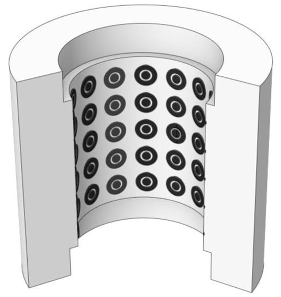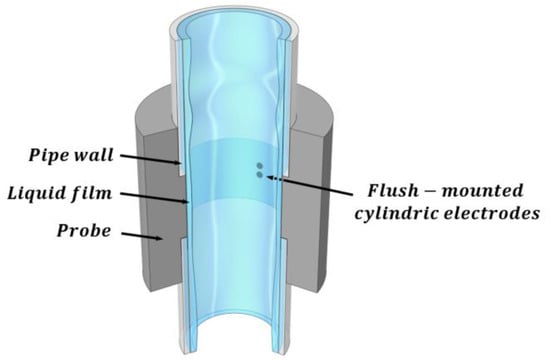 The conductance probes are based on the difference in electrical conductance of the liquid and gas phases [15,16]. There are different types of conductance probes depending on the application, such as, for instance, the two-ring electrodes formed by two ring shape electrodes, which are mounted along the circumference of the pipe perpendicularly to the flow direction, which has been studied by Fossa [17] and Tsochatzidis et al. [18], but this type of sensor is not appropriate to perform localized measurements of the film thickness because it provides an average value over the full ring. The two-plate electrode or the two circular electrode probes are more appropriate to perform localized measurements at a given point. In addition, normally people use a third electrode connected to the earth to diminish the parasitic currents [19]. Usually, researchers apply a high-frequency alternating current (AC) to the emitter electrode to avoid high gradients of ions and redox electrochemical reactions in the electrodes, which will degrade them. As with capacitance probes, one needs to calibrate the devices considering the configuration of the electrodes to obtain the existing relationship between water conductance and film thickness. The most representative arrangement is to place the electrodes flush-mounted with the wall’s existing different configurations of the electrodes, as previously discussed, being the most popular for localized measurements the one displayed in Figure 1. Ambrosini et al. [20] were the first ones to use the conductance probe, where a two-electrode emitter and receiver are mounted flush to the flow to minimize the interference with the flow behavior and especially with the liquid film. There are also conductance multi-probe systems that use a set of small conductance probes, usually flush-mounted, that are arranged as a set of concentric electrodes as displayed in Figure 2. These electrodes are mounted on a flexible PCB (printed circuit board) capable of taking the same shape through which the liquid layer displaces. Each electrode couple can give a spatial resolution for the measurement of the order of millimeters [21]. The main drawback is that we can have electromagnetic coupling among the different probes.