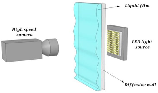The technique of light absorption by photography involves obtaining the quantity of light coming from a light LED source that is attenuated by the liquid layer and the wall as displayed in Figure 3. This result is obtained by using the Lambert–Beer law, which relates these two variables. In this technique, one needs to find the light attenuation coefficient of the corresponding liquid layer by calibration and, additionally, the reference intensity of the light source.