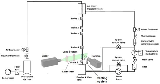 In this section, we first explain the characteristics of the GEPELON facility used to perform both the conductance probe measurements and the optical measurements with all the instrumentation used to measure the mass flow rates of gas and liquid, the pressure and the temperature, respectively. In addition, we describe all the instrumentation used to perform both the conductance probe measurements and the PLIF optical measurements. In the case of the PLIF optical measurements, we analyze the optical corrections by refraction and reflection that are necessary to achieve the correct value of the thickness, the subpixel correction of the interfacial edge [12,33,34], and the angle between the laser and the CMOS camera that is necessary to minimize the errors produced by the refraction and the total reflection.