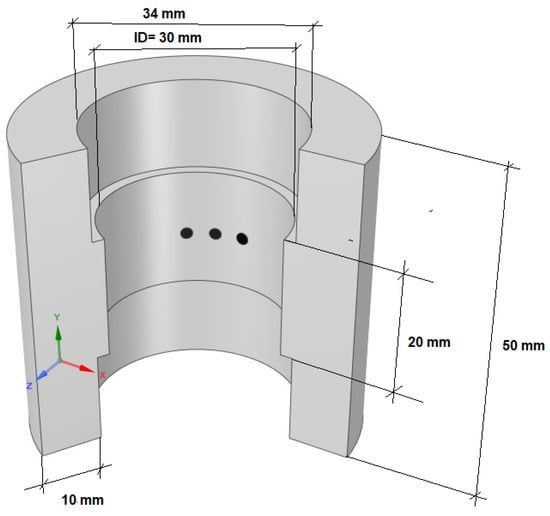 The port design of the conductance probes has been built by 3D impression because it guarantees the perfect alignment of the conductance probes and the distance among them. The first ones were manufactured mechanically but this procedure was discarded because we do have not in our laboratory the necessary precision to manufacture the sensor with the required accuracy for small electrodes and the distance between them. Figure 9 shows the port design along with the probes used in these experiments, the total length of the port is 170 mm and has an internal diameter in its central part equal to the test pipe diameter, i.e., 30 mm. Each conductance probe has three 1.5 mm ID electrodes, each spaced 1.5 mm and aligned perpendicularly to the flow direction. The conductance probe where the measurements were performed is located near the lower part of the test section near the bottom test entrance to have developed flow conditions. For the 30 mm diameter pipe, this distance was 117 hydraulic diameters (351 mm). The selection of the electrode diameter and the distance between electrodes was achieved as a compromise between the desired spatial resolution of the measurements, which diminishes with the total distance between the emitter and receiver electrodes and the range of the measurements or capability to measure larger thickness, which increases with the distance and size of the electrodes.