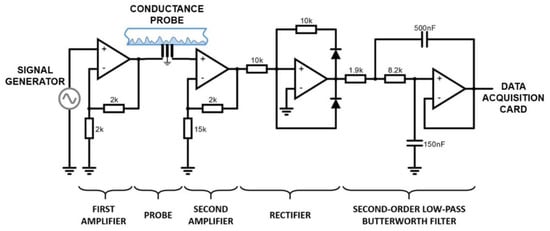 The electronic circuit associated with the conductance probe remains consistent with the one employed in previous publications [9]. The electronic design has the capability to emit, amplify, filter and receive the electric signal provided by the signal generator with a given frequency, and is shown in Figure 10. It comprises four high-frequency amplifiers, a pair of precision resistors (0.1% tolerance) and 1N4148 diodes. The electronic second-order low-pass filter is designed to cut off frequencies above 149 Hz using the Sallen–Key architecture [37]. Finally, a Butterworth filter was used to have an attenuation above the cut-off of −20 dB/decade.