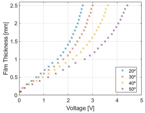 The calibration procedure was performed in two steps: in the first step, we obtained the calibration curves at different temperatures and for several film thicknesses using the same method used by Rivera et al [8,9] to check whether the shape of the curve is of the same type, i.e., a polynomial degree of 5 order for all the temperatures; see Figure 11. Confirming this result would allow us to use only the database generated at 20 °C for calibration purposes at any temperature between 20 °C and 50 °C, simply scaling the voltage value obtained for each specific base case test at 20 °C with the saturation voltage measured prior to each experimental data set at a given temperature.