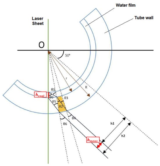 Figure 12 depicts a cross-sectional view of the tube, denoted by the two outermost arcs, and the liquid film within it, represented by the innermost arc. The central point of the tube is designated as O. The green line in the diagram indicates the laser sheet, and the camera is positioned at a fixed angle of 40 degrees (PLIF40). The true thickness of the liquid film is denoted as or , while the apparent measured thickness is represented as . Additionally, the inner radius and outer radius of the tube are denoted as r and R, respectively. The corrections needed were programmed in Matlab 2021 (MathWorks, Natick, MA, USA), and the main steps of the program are explained next.