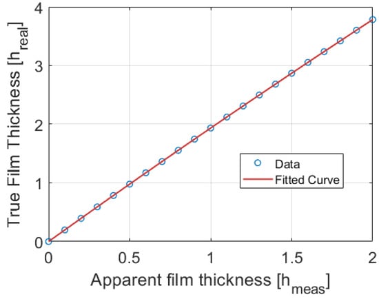 As mentioned before, this system of equations requires an iterative approach for resolution. To speed up the correction process to obtain the true value of the film thickness, it is possible to establish a fitting relationship between measurements and real value using a straightforward polynomial equation of second degree as has been carried out by Xue et al. [12]. For this set of experiments, the polynomial equation that relates the measured and true thickness is: