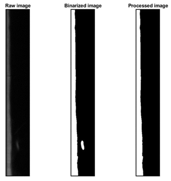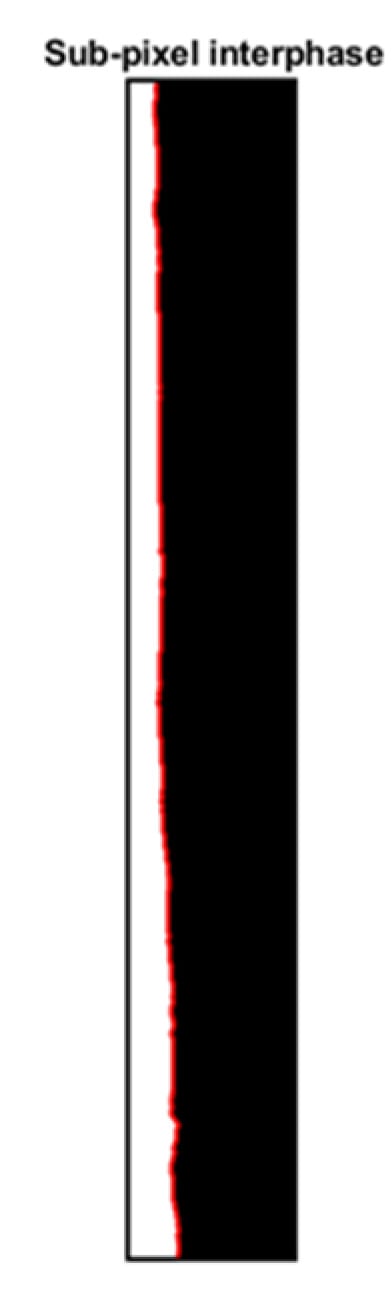 Based on the experiments of previous authors [12] and after checking it in the laboratory we decided to use the PLIF40 measurements. finding an efficient algorithm that meets the specifications. First, let us focus on a single image. The format of the saved images is TIFF, and to read this format in a Matlab image processing kit, the images are read as 3-dimensional matrices, which is not ideal for manipulation. Therefore, we use the “rgb2gray“ function of Matlab to convert the colors to grayscale (values ranging from 0 to 255), which gives us 2-dimensional matrices. First, we noticed that the difference between the two images is very small and practically negligible. To convert our grayscale image to a black and white image, we need to determine a threshold. Once the threshold is set, we compare each cell with this threshold: if the value in the cell is less than the threshold, the pixel is black; otherwise, it is white. To determine the appropriate threshold, we calculate the average of all values stored in the cells and this value will be used as threshold. After coding this procedure and processing the images, the result is satisfactory, and it is possible to clearly distinguish the liquid because some perturbing refractions that appear in the images have been removed, as displayed in Figure 15. Then, the function “bwperim” of Matlab is applied to the binarized image that returns a binary image containing only the perimeter pixels (contour) of objects in the input image. But this method produces errors when we have bubbles in the liquid film layer or when the interfacial waves fold back. In these cases, the measured film thickness is distorted and some kind of correction becomes necessary. The normally applied algorithm to correct these situations is the sub-pixel detection algorithm.