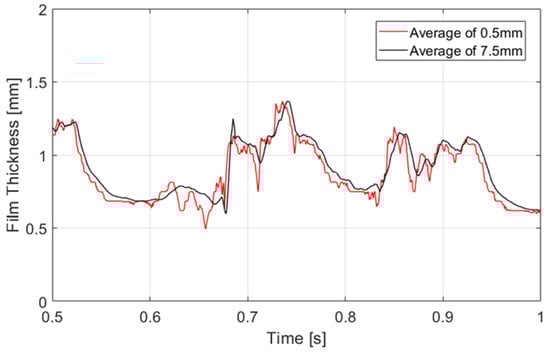 with x and y being the longitudinal and transverse coordinates, the absorption coefficient of the fluorescent light in the dye, K the interfacial reflection index between phases, equal to 0.02 for moderate interface slopes, and, finally, is a compensation matrix created to compensate for the non-uniformity of laser illumination and to create a reference value of brightness corresponding to a reference value of film thickness. Figure 6 displays the application of BBLIF methods in cylindrical pipes as performed by Isaenkov et al. [26] in a region of interest (ROI) of for cylindrical pipes. Also, Isaenkov et al. [26] performed measurements in rectangular ducts with a region of interest (ROI) of Based on these measurements, the authors concluded that the BBLIF technique can be used to measure film thickness in flat regions, but its sensitivity is smaller for thicker regions. Also, this method has some vulnerability due to light reflections in complex or agitated flows.