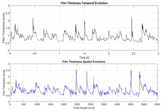 The annular flow is characterized by the presence of several types of waves at the interface between the phases, which enhance the heat transfer between the phases. The most important ones are the disturbance waves (DW) and the ripple waves (RW) [6,8]. The first ones, DWs, have a larger amplitude compared to the average thickness of the film (up to five times), they are periodic and show coherent behavior through all the sections of the annular ring of the tube, while the RWs are not periodic, and they do not show coherent behavior through the pipe section as the DWs [6]. The main characteristics of the annular flow being measured are the film thickness, the amplitude of the waves and their frequency.