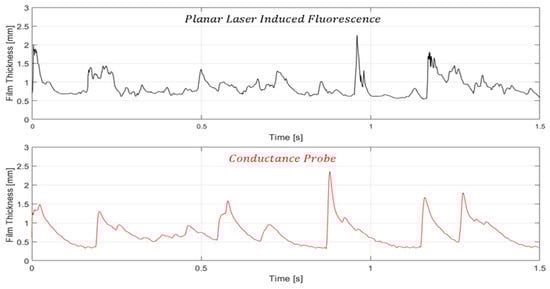 Conductance probes are based on the conductance value measured between the emitter and receiver electrodes at high frequencies, which depends on the liquid film thickness [15,16,17,19,36]. This technique is one of the most used when trying to measure temporal variations of film thicknesses because the sampling rate of the measurements can attain very high values as sample/s, providing the evolution of the waves with time with a good precision that basically depends on the separation between the center of the electrodes. Also, this technique is cheaper than the LIF technique, as will be discussed later. The operation of conductance probes adheres to the principles of potential field theory. Under this framework, the response of the liquid layer located between the electrodes, when subjected to an alternating current, exhibits resistive behavior. This behavior is attributed to the notably low electric permittivity, and the frequency-dependent behavior becomes marginal at elevated frequencies [15].