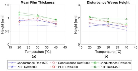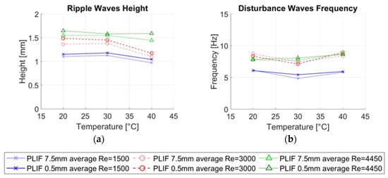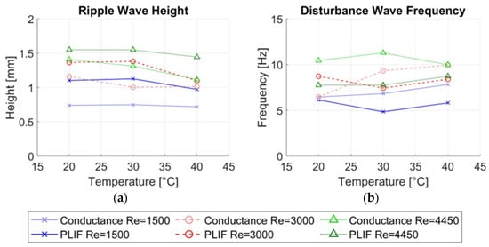Different techniques are used to analyze annular flow, but the more interesting ones are those techniques that do not perturb the flow and provide enough resolution to clearly distinguish the interfacial phenomena that take place at the interface, especially the disturbance waves (DW) and the ripple waves (DW). The understanding of these events is important because it influences the heat and mass transfer taking place through the thin film formed near the walls in this flow regime. The laser-induced fluorescence (LIF) and the three-electrode conductance probe are two commonly used techniques to study experimentally annular flow phenomena. In this paper, a set of experiments at different temperatures of 20 °C, 30 °C and 40 °C and different liquid Reynolds numbers have been performed in the annular flow regime, the characteristic of the DW and RW as average height and frequency of these waves has been measured by both techniques LIF and conductance probes. In addition, we also measured the mean film thickness. It was found that the mean film thickness and the DW height are practically the same when measured by both techniques; however, the height of the RW is smaller when measured by the conductance probe and this difference diminishes when the temperature increases.