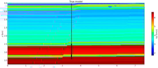 The velocity model is based on the SEAM Arid model [39]. The SEAM Arid model is built from the Barrett model designed to represent unconventional reservoirs in Texas and near-surface model generated to represent land data challenges typically faced in exploration in the Middle East; it has been used extensively for studies on deep learning-based inversion of seismic data [40], acquisition design for VSP [41] and surface seismic [42], and evaluation of structural uncertainty in challenging desert environments [43]. We created 135 shot gathers in the size of 2000 (samples) by 1098 (traces) with different offsets ranging from 0 to 3.5 km by moving the shot location from left to right in the model in Figure 3 with increments of 50 m.