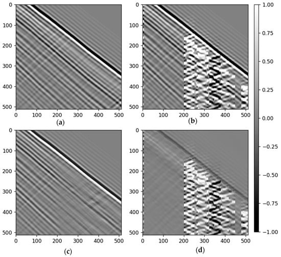 To further evaluate the predicted results quantitatively on the synthetic dataset, we introduced the Structural Similarity Index (SSIM) [46] as metrics. The SSIM can measure the similarity between the denoised output/noisy data and the ground truth. The SSIM ranges from −1 to 1. When two images are identical, the value of SSIM is equal to 1. The SSIM of the data shown in Figure 5, where it improved from 0.67 to 0.81.