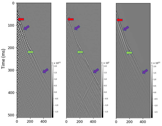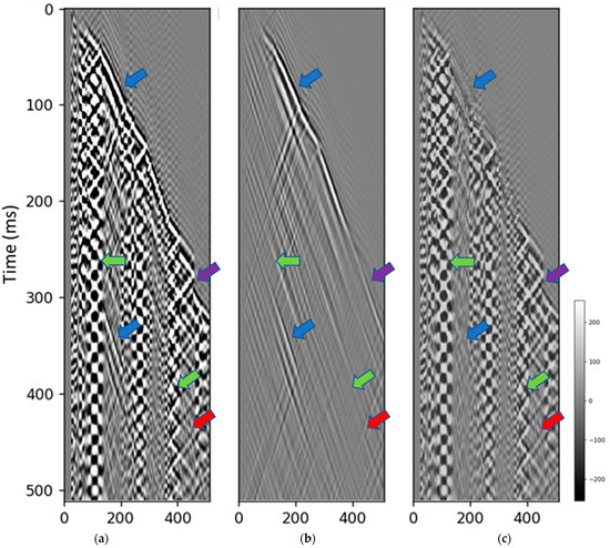The denoising result for the Citronelle dataset. (a) field data input, (b) diffusion model denoised data, (c) predicted noise. The green arrows indicate that the noise is successfully suppressed. The blue arrows indicate the preserved signals. The purple arrow indicates the calibration of first arrival. The red arrow indicates the signal leakage.