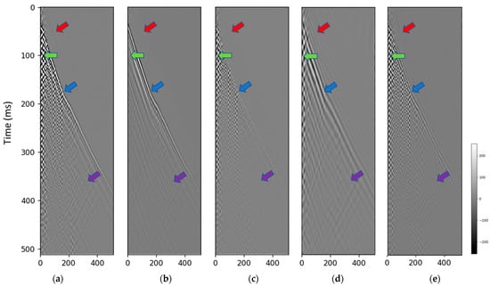 Comparisons between the input data shown in Figure 6a, denoised output (Figure 6b), and predicted noise (Figure 6c) provide several key observations. The green arrows indicate the areas where the noise was successfully suppressed in the denoised output, compared to the raw input data. This included attenuation of strong zigzag and checkerboard noise patterns. The blue arrows pinpoint the regions where primary reflection signals were preserved during denoising. The continuity and relative amplitudes of these events were maintained from input to output. The purple arrow shows an example where the first arrival direct wave was properly calibrated and aligned between the input and denoised data. This demonstrates the model’s ability to retain important signal components. The red arrow highlights an area of signal leakage where remnants of the reflection event persisted in the predicted noise. This indicates the model needs further tuning to completely remove noise without signal loss.