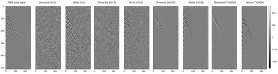 To assess the efficacy of our proposed method, we initially utilized the synthetic testing dataset (Figure 5). Figure 5a displays the clean synthetic data produced via Deepwave [45] and DAS conversion. The 2D synthetic DAS-VSP data, embedded with diverse noise types, is depicted in Figure 5b, exhibiting an input SNR of 8 dB. Figure 5c illustrates the denoised outcomes derived from our proposed diffusion model, while Figure 5d portrays the extracted noise. A notable improvement in the signal-to-noise ratio (SNR) was observed, increasing to 24 dB. The denoised data gathered in Figure 5c which is barely distinguishable from the clean data in Figure 5a, and underscores our method’s capability to attenuate noise while retaining the signal. However, minor signal leakage was observed when examining the removed noise in Figure 5d. Minor signal leakage appeared to be inevitable as the signal from some upgoing reflections resembled the noise when superimposed with downgoing waves.