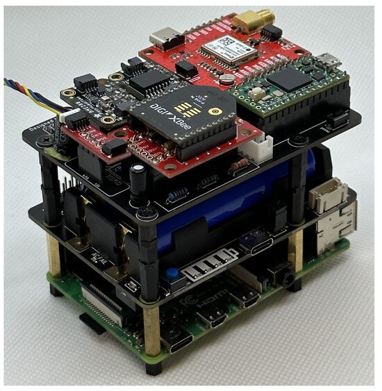 Each component is mounted on pin headers, and each PCB layer stacked, so that users can swap and remove modules as needed for a variety of deployment scenarios and applications. For example, if the XBee is physically removed for a drone flight, the rest of the software still runs but no longer initialises and schedules the Xbee task. This design also includes an independent uninterruptible power supply with 18,650 batteries, removing the reliance on buck converters and the host vehicles’ (drones) power, which will reduce the flight time. Using the onboard USB-C port, the batteries can be charged, with an LED bar indicating the charge level.
