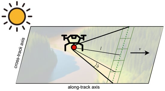 See Figure 4 for a visual. Whether the drone or aircraft is able to fly at this speed depends on the platform and control parameters. For example, when using the Pix4D application to control the drone’s flight path, the smallest allowable speed was 1 m/s, so we flew at 1.4 m/s (an integer multiple of v) and later spatially binned the data to 5.8 cm pixels. For higher spatial resolutions, the altitude l can be decreased accordingly.
