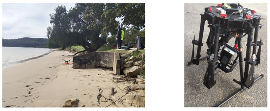 Trial site preparations. (left) The beach where we performed our in flight tests. (right) The completed DAQ and camera mounted on a gimbal ready to be deployed. The GNSS antenna was carefully routed to the top.