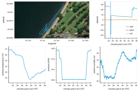 A summary of the data is shown in Figure 6. From the quaternions, the camera orientation was calculated in a local north-east-down (NED) frame. After every data collection session, the timestamped sensor measurements were saved, along with summary plots.