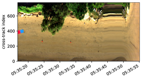 RGB composite of one hyperspectral datacube using selected bands (red = 640 nm, green 550 nm, blue 470 nm). The along-track axis is indexed by UTC time synced to the GNSS time. The stretch feature at 05:35:45–50 was due to the drone stopping before descending.