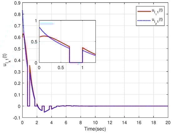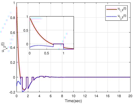 where  and  are inferred according to Assumption 5. Let ,  and  are obtained as . Meanwhile, as ,  approaches ∞, which implies that . From (A19),  with , which implies that  and . Then, we say that the developed switched error system (14) is stabilized, which means that the proposed distributed aperiodic intermittent controller (6) can achieve containment tracking.