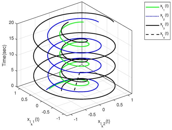 Multi-agent systems in distributed cooperative settings have been a research focus because of their widespread applications, including spacecraft formation flying [], mobile robots [], and sensor networks []. An increasing number of studies consider various cooperative control problems under two types of network frameworks: leaderless and leader-following [,]. In the leader-following framework involving consensus with only one leader, a set of agents must reach the tracking trajectory of interest. In some real-world scenarios, agents are not forced to reach the same value or trajectory. As a special class of cooperative controls, containment control aims to drive all followers into a desirable region formed by multiple independent leaders []. In general, multi-agent systems can be divided into two broad classes according to their dynamics: homogeneous and heterogeneous [,]. Homogeneity signifies that the dynamics of the agents are identical, whereas heterogeneity signifies nonidentical dynamics, which makes the containment problem more challenging but practical and prospective.