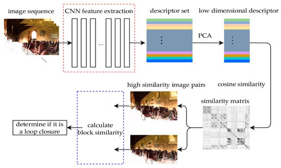 Firstly, the pretrained CNN model is used to extract image descriptors and gather all the descriptors extracted from the image sequence. Then, the descriptors are subjected to a principal component analysis (PCA) and whitening to reduce some relevant dimensions, thereby reducing the subsequent computational complexity and preserving the main information. Finally, the cosine similarity of these descriptors is calculated, and a similarity matrix is generated. The similarity matrix is a symmetric matrix, each row of which can be regarded as a sequence of the current query image; each column can be regarded as a loop closure candidate. The query image is only compared with the image before the current time, and the image with the highest similarity to the query image can be found in this matrix. The two images with the most similarity are found, and the overall similarity is recalculated using the block similarity calculation module. The recalculated similarity is used to determine whether loop closure has occurred.