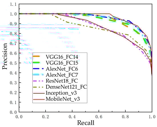 Directly calculating similarity from image data requires a significant amount of computation, and the results are frequently unreliable due to variables such as changing lighting, shifting viewpoints, and dynamic environments. An image descriptor is a vector used to represent an image, and representing the image as a vector is a necessary process for loop closure detection. Pretrained CNN models typically have good generalization performance while also reducing the time cost of retraining the network. Using a pretrained CNN to extract image features means richer image information can be used than with manually designed features. Visual Geometry Group 16 (VGG16) [], AlexNet [], Residual Network 18 (ResNet18) [], MobileNet version 3 (MobileNet_v3), etc. [], have shown good performance in practical applications such as image classification, image retrieval, image recognition, and other tasks. We performed loop closure detection on these CNN models using a public dataset from New College. Using the fully connected layers of these network models to extract image description vectors, the cosine similarity between the description vectors can be utilized to represent the similarity between images. The accuracy achieved with different recall rates is obtained by adjusting the similarity threshold, and these data are plotted into precision–recall curves. The precision–recall curves of different pretrained CNN models are shown in Figure 2.