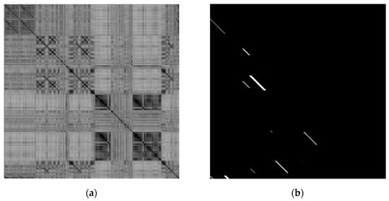 Similarity matrix and loop closure matrix of the New College dataset: (a) similarity matrix in the MobileNet_v3 model; (b) loop closure matrix.