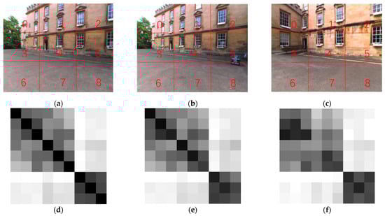 In Figure 5, subgraphs (a) and (b) are correct loops, while subgraphs (a) and (c) are incorrect loop closures. Subgraph (d) is the matrix similarity SM1 between each image block of subgraph (a) and all image blocks of subgraph (a). Subgraph (e) is the matrix similarity SM2 between each image block of subgraph (a) and all image blocks of subgraph (b). Subgraph (f) is the matrix similarity SM3 between each image block of subgraph (a) and all image blocks of subgraph (c).