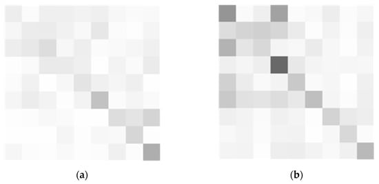 In Figure 6, subgraph (a) represents the similarity difference matrix SM_d1, obtained by subtracting the absolute values of SM1 and SM2; subgraph (b) represents the similarity difference matrix SM_d2, obtained by subtracting the absolute values of SM1 and SM3.