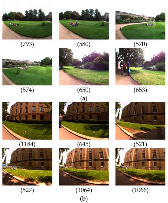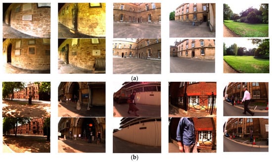The experiment used two publicly available datasets, namely, the New College and City Center datasets. New College and City Center are datasets provided by the Mobile Robotics Group of the University of Oxford []. During the robot’s image acquisition process, images are collected approximately every 1.5 m and are commonly used for loop closure detection evaluation testing. Images of the dataset are shown in Figure 8. The detailed parameters of the dataset are shown in Table 3. Both datasets are composed of binocular images, and only the left images are utilized in this experiment.