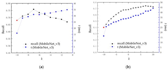 In Figure 9, subfigure(a) represents the experimental data from the New College dataset, and subfigure (b) represents the experimental data from the City Center dataset. The red dot at k = 10 indicates the recall rate of the loop closure detection algorithm based on the MobileNet_v3 CNN model at 100% accuracy, without applying the block similarity calculation module. The experimental results show that as parameter k increases, the loop closure detection performance of this algorithm first increases and then decreases. Within a certain range, the recall rate at 100% accuracy is higher than the red dot; outside of this range, it will be lower than this point. This is mainly because as parameter k increases, the similarity of error loop closure image pairs with similar appearances gradually increases compared to many correct loop closure image pairs with less similar appearances, resulting in a decrease in recall rate at 100% accuracy.