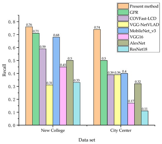 As depicted in Figure 10, compared with the loop closure detection algorithms based on four CNN models—MobileNet_v3, VGG16, AlexNet, and ResNet18—the proposed present method has improved recall rates at 100% accuracy. The results show that this method can effectively improve the loop closure detection effect. Compared to the New College dataset, this method demonstrated a significant improvement in performance on the City Center dataset. There are many dynamic environments in the City Center dataset, indicating that the present method is more suitable for such scenarios.