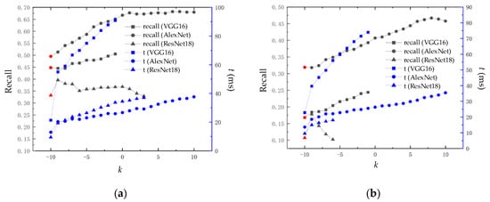 In Figure 11, the red dot at k = 10 represents the recall rate at 100% accuracy of the loop closure detection algorithm based on the CNN model without the application of the block similarity calculation module. We found that the experimental results show a similar trend to the experimental results in Figure 9; the VGG16, AlexNet, and ResNet8 CNN models have improved recall rates at 100% accuracy after the application of the block similarity calculation module. This indicates that the block similarity calculation module can effectively improve the loop closure detection effect, reflecting the universality of the block similarity calculation module. It is worth noting that VGG16, due to the long time needed to extract image descriptors, increases rapidly with the increase in k, resulting in difficulties in real-time performance.