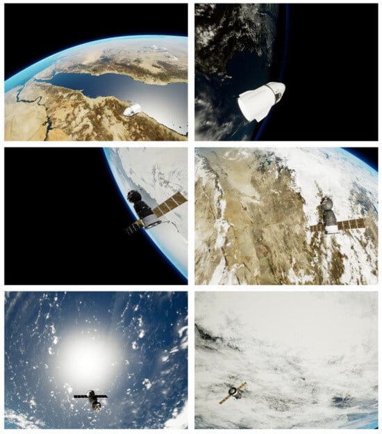 Proenca et al. [21] conducted simulations involving two spacecraft, namely Soyuz and Dragon, on Unreal Engine 4. They proceeded to construct an URSO dataset, proposed a deep learning framework for orientation-based soft classification for bit pose estimation, and used ResNet as the backbone network to directly regress the output pose. This was achieved by extracting bottleneck features and minimizing the relative error, which served as the loss function. This paper conducts relevant research through the URSO dataset, which uses multiple satellite models, providing a robust foundation for assessing the model’s universality. In addition, this dataset uses Unreal Engine 4 to render rich space backgrounds and restore as many real-world space environments as possible, as shown in Figure 1. While these complex backgrounds simulate the real space environment, they can significantly impact the accuracy of satellite pose estimation.