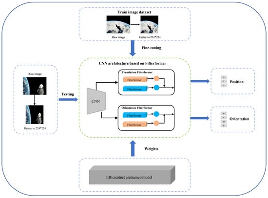 To address the aforementioned challenges, we designed a new end-to-end satellite pose estimation network, which can reason out the satellite pose information in a single step, simplifying the inference process. The network mainly comprises a CNN backbone module, a translation regression network, and an orientation regression network. The CNN backbone module loads the EfficientNet pretraining model and learns the data’s feature information. The translation regression network and orientation regression network are mainly composed of filterformer and fully connected layers, in which filterformer integrates the transformer encoder and filter design ideas and generates adaptive weights by using the hypernetwork-like class [27]. This approach outperforms conventional convolutional neural networks and other network architectures in the satellite pose estimation task. The main contributions of this paper are as follows: