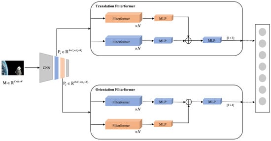 The proposed FilterformerPose mainly consists of the following components: a CNN backbone loaded with Efficientnet pre-trained weights, a filterformer-based translation regressor, and an orientation regressor. The model utilizes the CNN backbone based on the Efficientnet [35] model for satellite image feature learning, which learns image features at various scales through a multilayer CNN structure. Furthermore, the model decouples the satellite’s translation and orientation information through the use of a two-channel filterformer network.