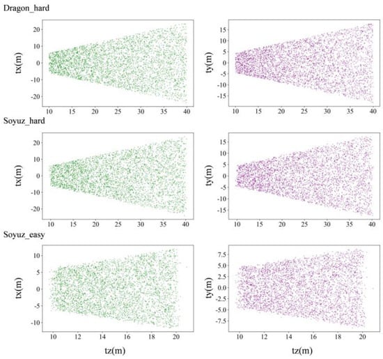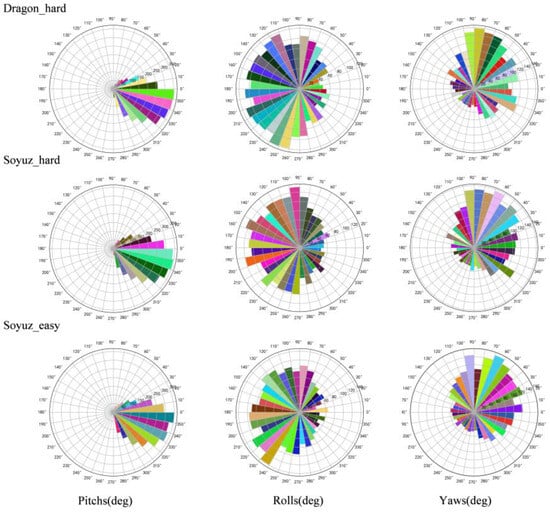As can be seen from Figure 6 and Figure 7, soyuz_easy is mainly distributed in the range of 8~22 m from the observation point, 0~12 m up and down; soyuz_hard is mainly distributed in the range of 8~42 m from the observation point, 0~22 m up and down; and dragon_hard is mainly distributed in the range of 8~42 m from the observation point, 0~22 m up and down. In the orientation angle, the distribution across all three datasets is relatively consistent, the pitch angle is in the range of −60°~60°, and the yaw and roll angles cover all angles. Through an analysis of the pose distribution within the URSO dataset and its alignment with tasks related to satellite pose estimation, it becomes evident that the dataset’s distribution aligns with the requirements of these tasks. It boasts a wide-ranging data distribution, which serves as strong support for real-world applications within this scenario.
