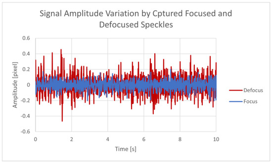 To exhibit the advantages of our defocused capture method, we tested the sensor with focused and defocused lenses. For this test, the speckle patterns from a 400 µm covered fiber were captured with an adjustable 12–14 mm lens under a water flow of 6.6 L/min and a leak diameter of 6 mm. The recordings were 10 s long, with five repetitions per state. After processing the recordings using the cross-correlation algorithm, the absolute average amplitude was calculated. Overall, the defocused speckle patterns produced an average amplitude twice that obtained from the traditional focused images. Therefore, we obtained a higher sensitivity of the sensor. A comparison between two of the tests is presented in Figure 3.