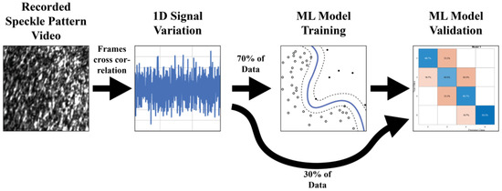 To find an automated and reliable way to detect leaks, we applied ML methods. In the statistical analysis, the data were averaged to produce easy-to-analyze graphs; however, this process caused significant data loss. For ML data processing, we used the 1D signals from the previously analyzed speckle pattern videos. As each dataset was unique, the ML algorithm needed to be fine-tuned to produce the best predictions. The selected ML algorithms were KNN and SVM, with a fine setting for the KNN’s number of neighbors and a medium size for the SVM’s Gaussian function. Each recording was divided into 10 segments, and the number of training samples was multiplied. Overall, each test configuration included 30 samples containing 100 data points each. For the training, a common cross-validation technique was applied—K-fold (10-fold) cross-validation—to prevent the algorithms from overfitting. The model trained with K-1 subsets was validated using the remaining subset. This step was repeated ten times to ensure that each subset was validated exactly one time. We decided to use supervised learning for all of our ML testing. A total of 70% of the data were used to train the model, while 30% of the data were used to validate its accuracy. The duration of training and validation was about 10 s per algorithm.