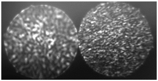 Three sensor types were tested under multiple flow rates, and each test was repeated three times. A high-speed camera (Basler acA1440-220 µm) recorded speckle pattern videos at 100 fps with a resolution of 992 × 512 pixels. We used a 400 µm fiber placed inside a pipe and a 200 µm fiber on its outer surface (both covered), as well as two 400 µm fibers inside a pipe, with one covered and the other exposed. A green 532 nm laser illuminated the fiber inlet. The propagating light was divided 50/50 through a splitter, and the speckle patterns from each fiber’s outlet were simultaneously recorded. The speckle pattern image from the two fibers captured in the footage is presented in Figure 5.