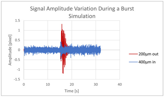 With the same protocol, we repeated the burst tests using the 400 µm covered and exposed MMF sensors inserted into the pipe. Both sensors showed similar results; during the burst simulation, the maximum signal amplitude increased by up to 4.67 times. The results of the two tests comparing the maximum signal amplitudes between the undisturbed flow and burst simulation are presented in Table 2.