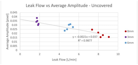 While this method of data processing makes it easy to compare many tests, the raw signal data are more information-dense than the single-value average. The relation of the signal amplitude and leak flow from the recordings of the 400 µm covered fiber with leak diameters of 8 mm and 3 mm under a 1.05 L/min flow is presented in Figure 9.