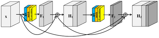 To further improve the feature extraction ability of model, a Spectral–Spatial Joint Dense Block (S2DB) is proposed inspired by Dense Convolutional Network [42]. Different from S2RB, there are skip connections between each layer and all preceding layers in S2DB as shown in Figure 3. Consequently, the output feature maps of the first layer are formulated as . This is the same as the output feature maps of S2RB. But for the second layer, the output feature maps of S2DB are formulated as . Compared to the H2 of S2RB, there is an additional term x in the H2 of S2DB.