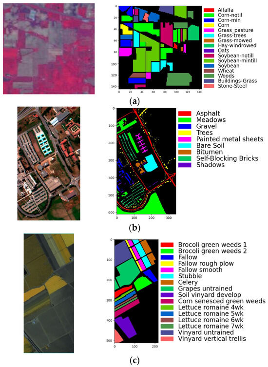 The pseudocolor images and ground-truth: (a) IP; (b) UP; (c) SV.