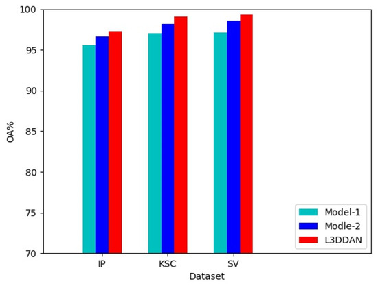 To evaluate the effectiveness of the S2DB in L3DDAN, two comparative networks named Model-1 and Model-2 were constructed. The Model-1 and Model-2 networks were constructed by replacing the S2DB in L3DDAN with normal 3D convolution operations and S2RB, respectively. The three networks are identical except for the above difference. Comparative experiments were conducted under identical parameters and the experimental results are shown in Figure 6. It can be seen that the highest classification accuracies were achieved on all three datasets by L3DDAN, followed by the Model-2. This indicates that the dense connection structure further improves the feature extraction ability of the network compared to residual skip connection.
