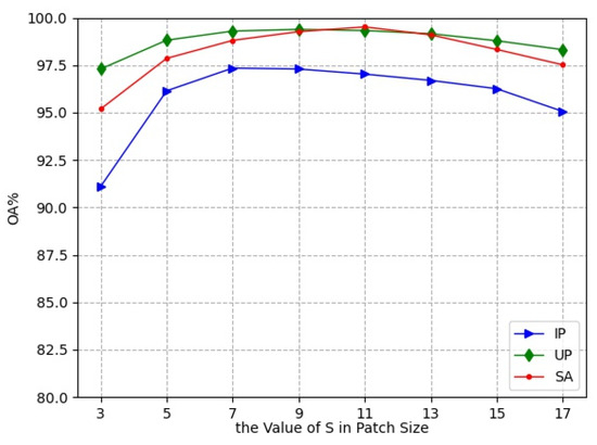 As the spatial size increases from to , the classification accuracies first increase and then decrease. The OA reached the maximum value when the spatial size of patches was , and for the IP, UP, and SA datasets, respectively. This indicates that increasing the patch size appropriately can bring more spatial information, but oversize introduces noise and reduces the classification accuracy. The patch sizes , and were the optimal selections for the three datasets in the proposed network.