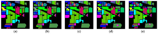 The classification results of the IP dataset are demonstrated in Table 5. From Table 5, it can be seen that the 1D-CNN achieves the worst results with only 75.67% OA. The main reason is considered that the spatial information is not utilized for classification. Compared with the 1D-CNN, the 2D-CNN, 3D-CNN, and 3D-CAE improve the OA to 83.48%, 84.08%, and 82.27%, respectively, because they consider both spectral and spatial information simultaneously. The accuracies of DBDA and DBMA are improved further by introducing attention mechanism and dense structure. For L3DDAN, the highest classification accuracy is achieved thanks to the autoencoder structure and spectral–spatial joint dense block.